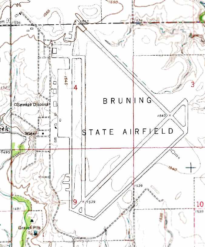 Bruning State Airport was listed among active airports in the 1962 AOPA Airport Directory, with a single 6,800' paved runway.