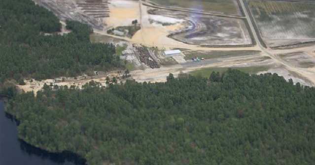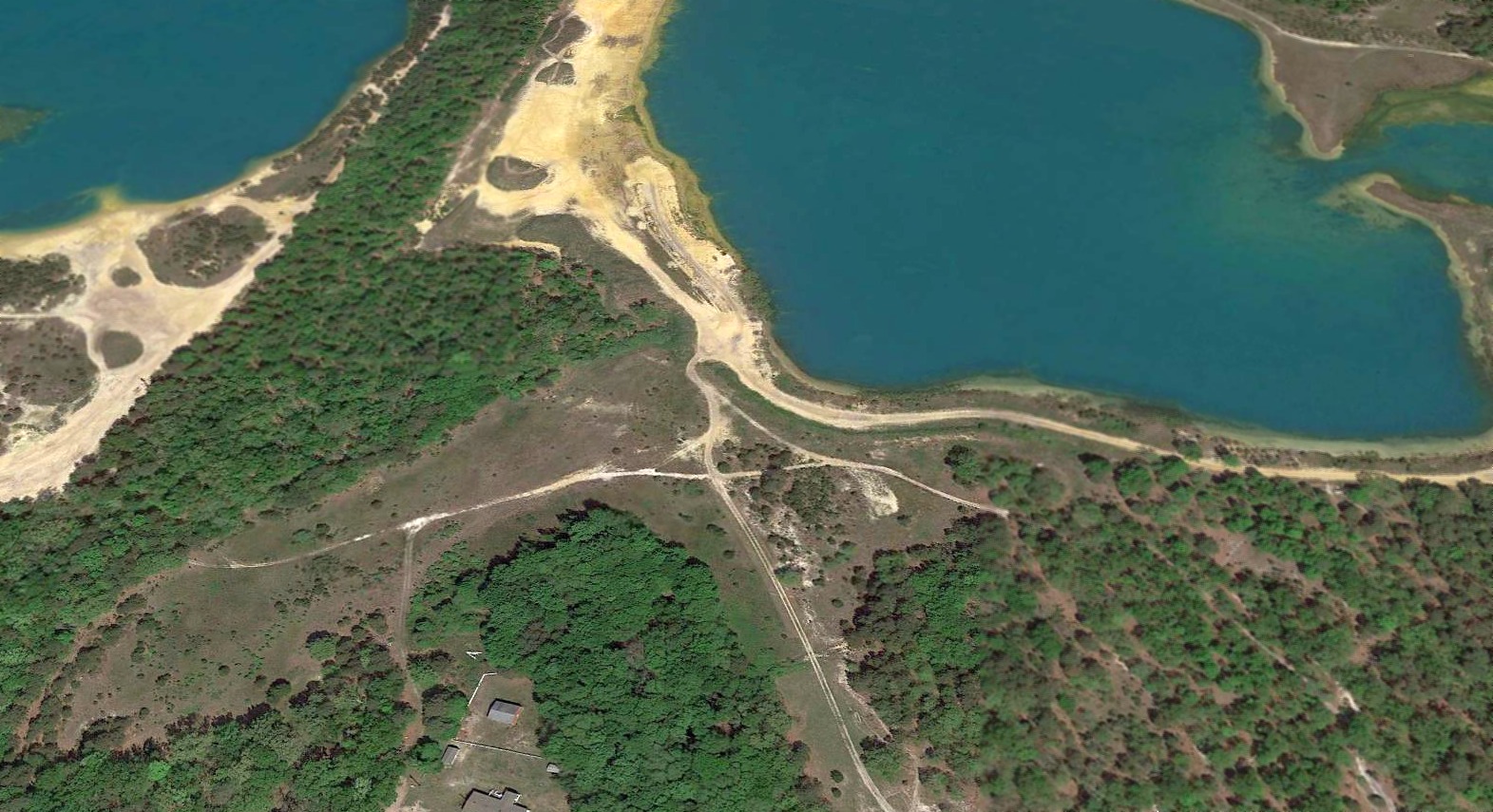 A 2016 aerial view looking northwest at the site of Piney Hollow Airfield shows the majority of the property covered by a flooded sand mining pit,
