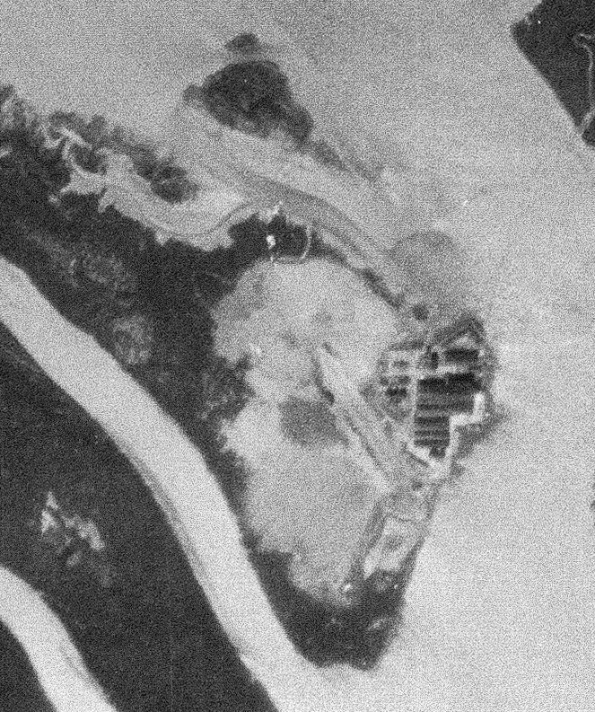 The earliest depiction which has been located of the Crab Island Fish Factory Airfield was a 1956 aerial view.