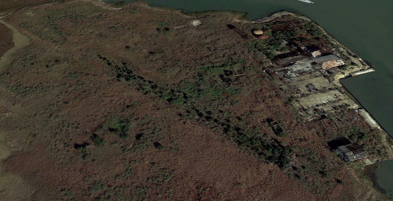 A 2017 aerial view looking northeast showed the remains of the Crab Island Fish Factory runway (from top-left to bottom-right), with the ruins of the factory on the right.