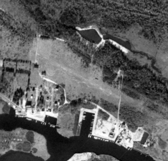 A low resolution 10/1/56 USGS aerial view barely depicted the Crab Island Fish Factory Airfield to the west of the factory buildings.