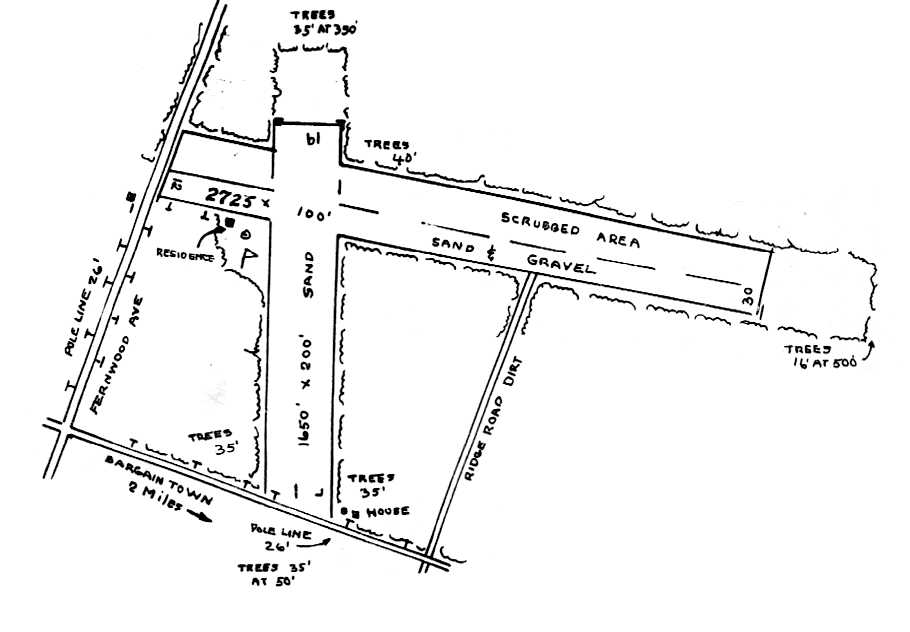 It depicted a single northwest/southeast paved runway, labeled “Landing Field”, with several small buildings along the south side.