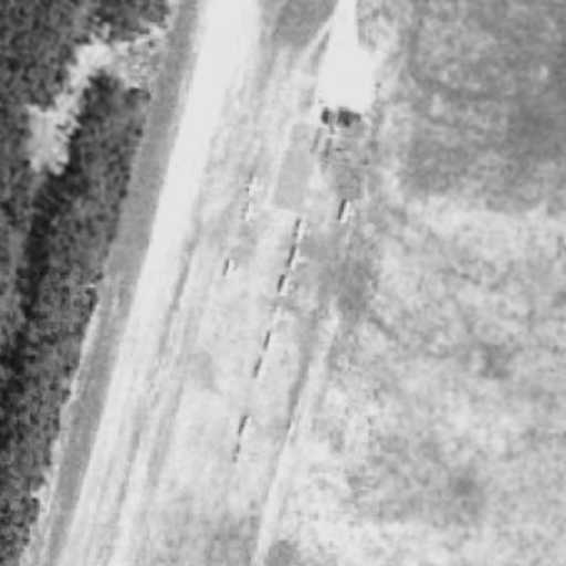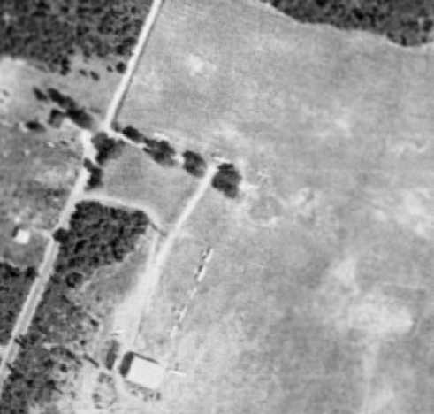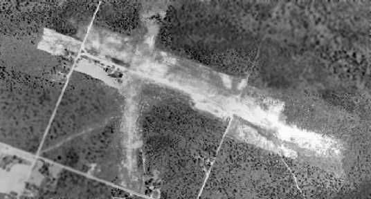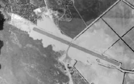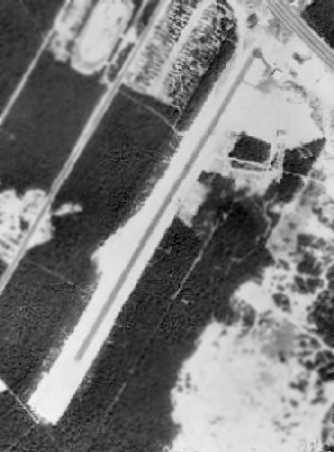 What may have been a few small hangars were visible on the east side of the runway, but no aircraft were visible on the field.