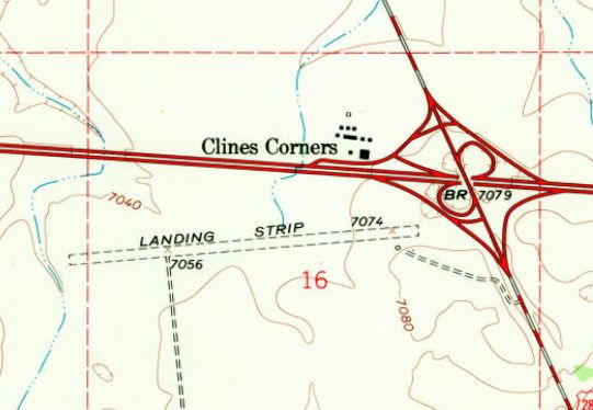 It depicted Clines Corners Airport as single east/west runway with a small building on the southeast side.