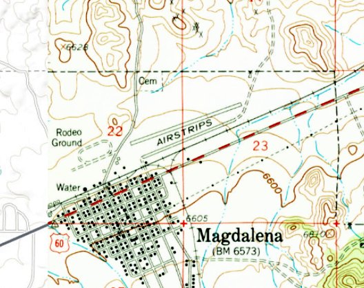 The 1959 USGS topo map depicted Magdalena Municipal Airport as 2 parallel runways, generically labeled as “Airstrips”.