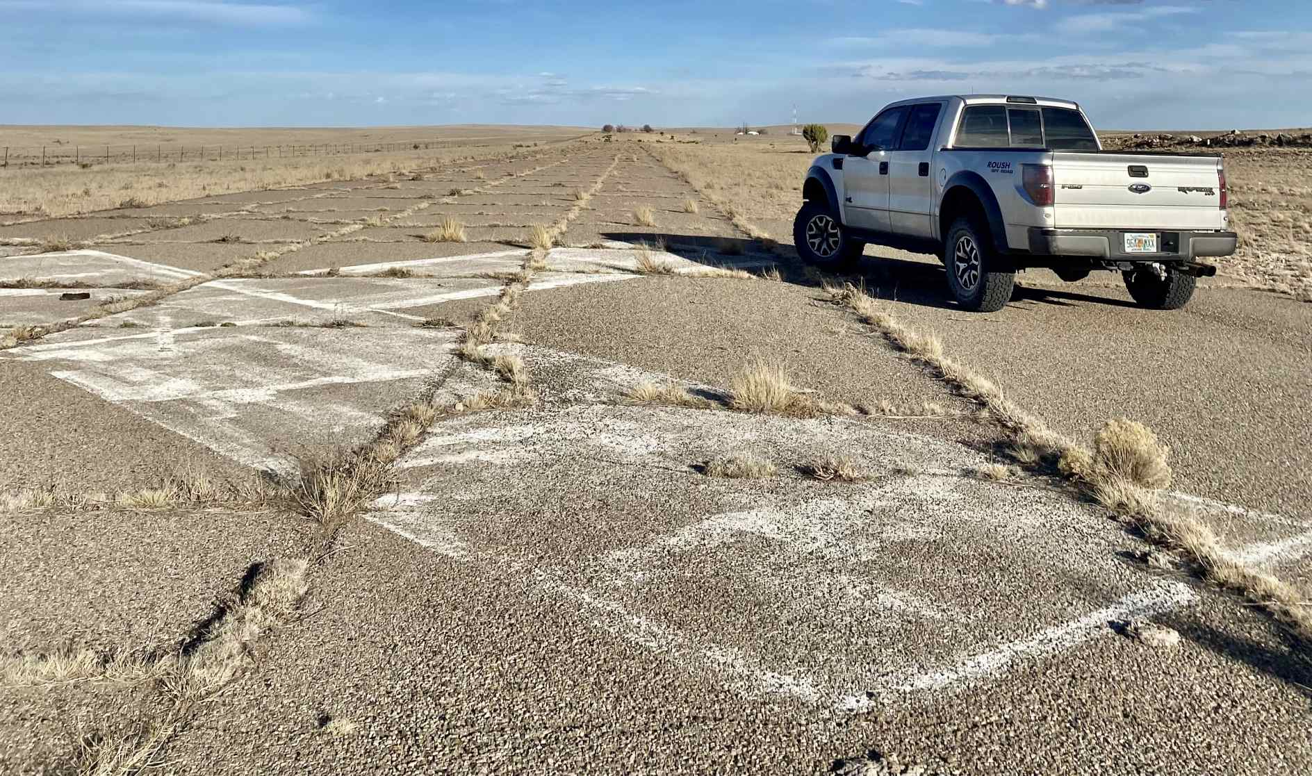 A 2014 photo by Matt Franklin looking west along the Clines Corners Airport runway.