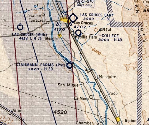 A 1967 NM State Land Office map depicted the Mesquite Airfield (east side of map), as well as the Stahmann Farms Airfield (west side of map).