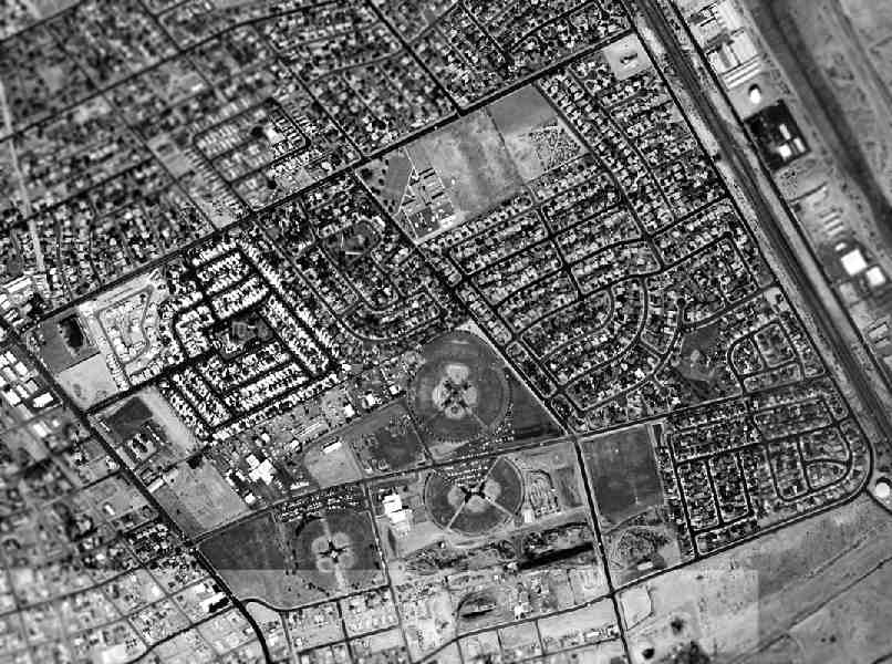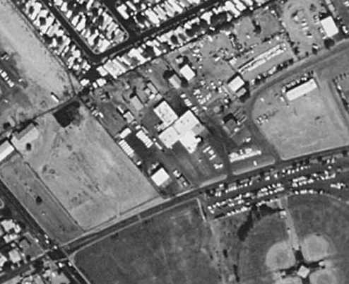 A circa 2001-2006 aerial view looking north at what appear to be former T-hangars, with the former runway (now Appaloosa Drive) at the bottom),