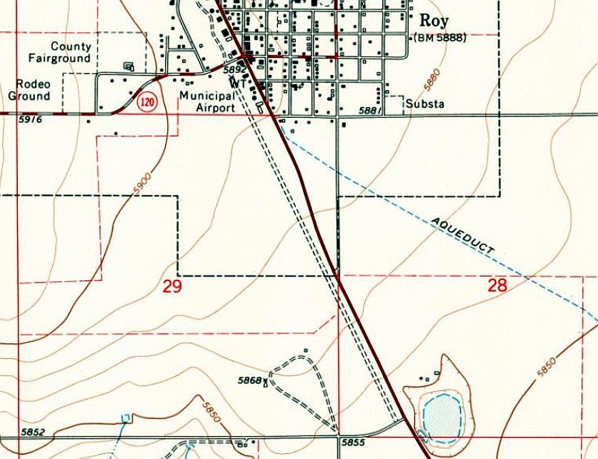It depicted Roy Municipal Airport as having an unpaved northwest/southeast runway, and a number of small buildings along the northeast side.
