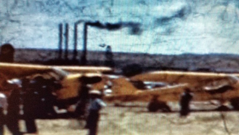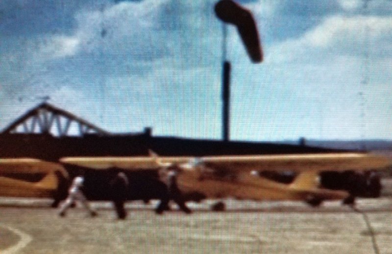 A still from a September 1940 movie by James Bickle of a delivery flight of several new Piper Cubs, in front of the hangars of the original Gallup Airport (courtesy of Bill Bickel, via Dan Rhinehart).