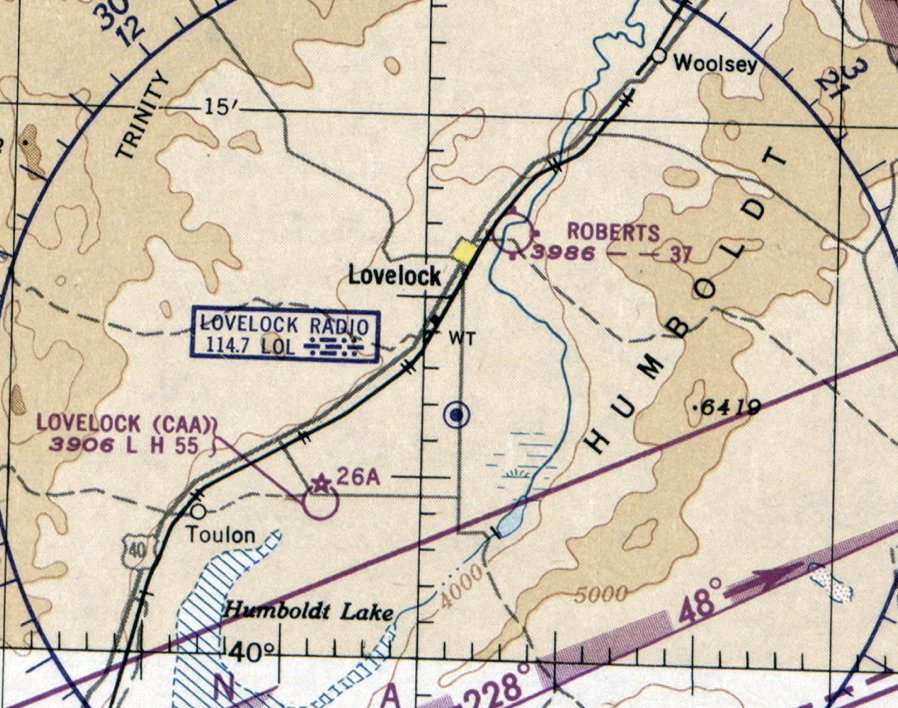 Jonathan Westerling reported, “The last depiction of Lovelock Airpark on a Sectional Chart was in June 1960, and the airport was not included in any airport directories after this time.”