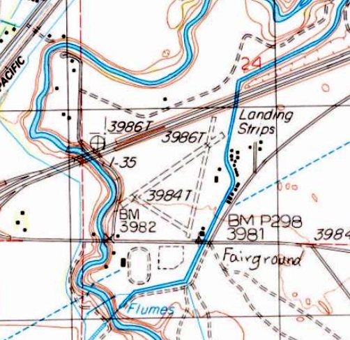 It showed 3 shorter unpaved runways on the south side of the highway, generically labeled as “Landing Strips”.