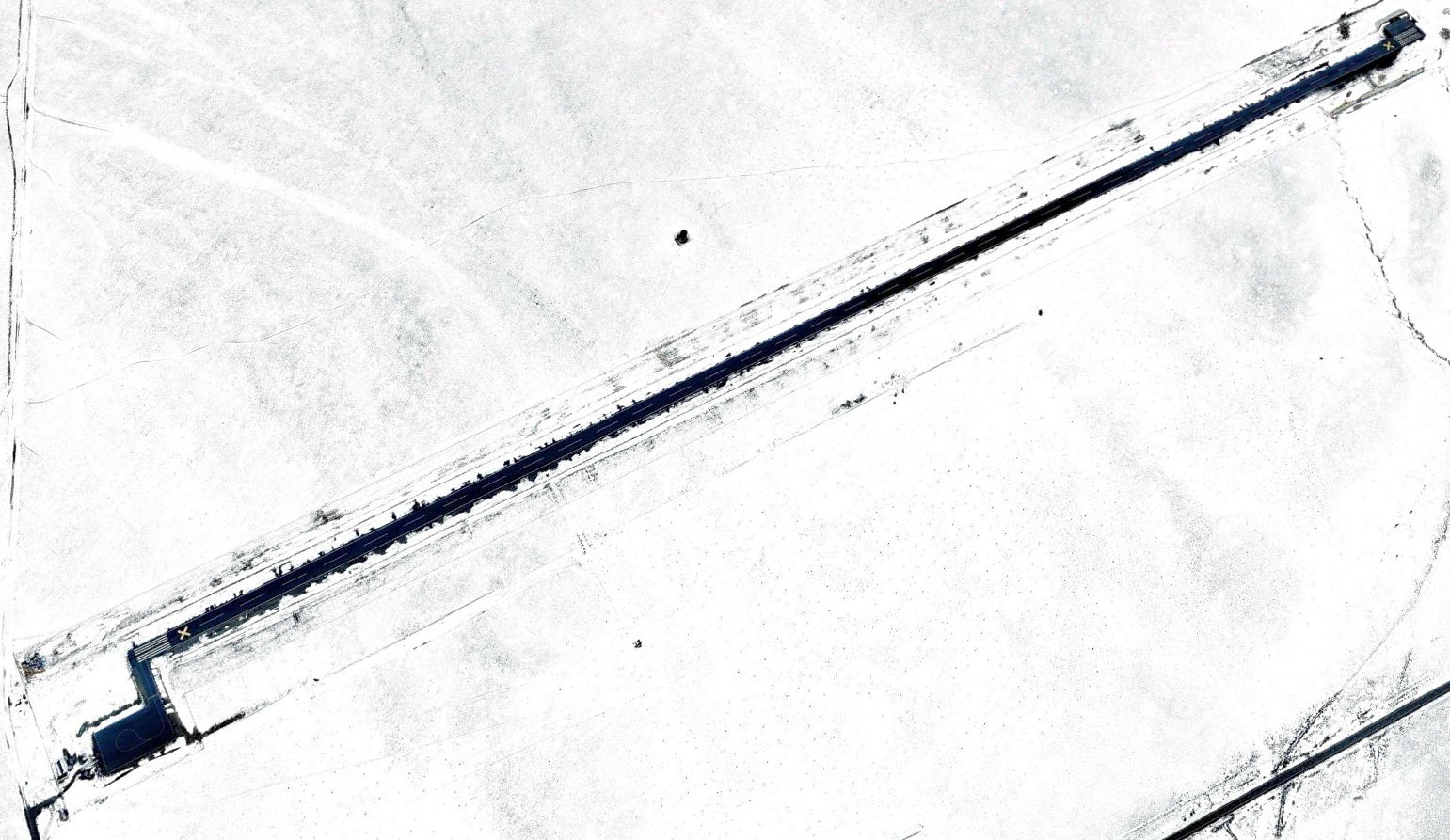 A 2023 aerial view looking northwest showed the Basecamp Airfield runway to still be painted with closed-runway “X” symbols, yet was neatly plowed of snow.