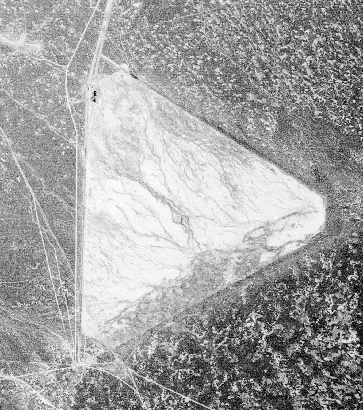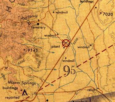The only buildings depicted were 3 small structures across the road to the south, labeled “Central NV Test Site Base Camp”.