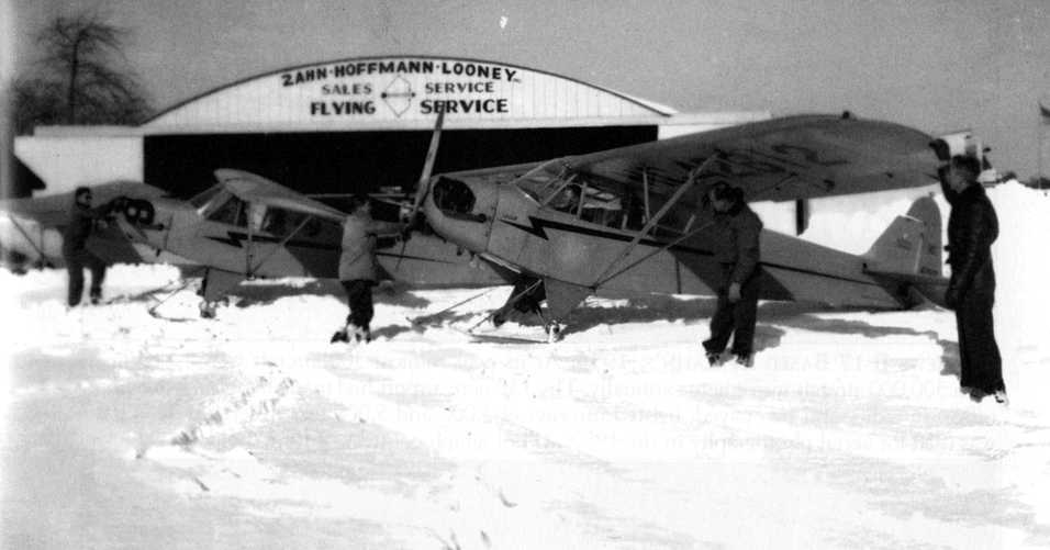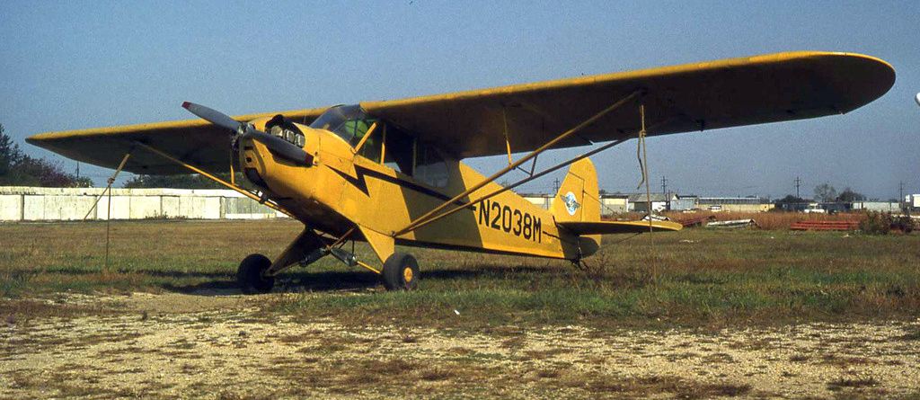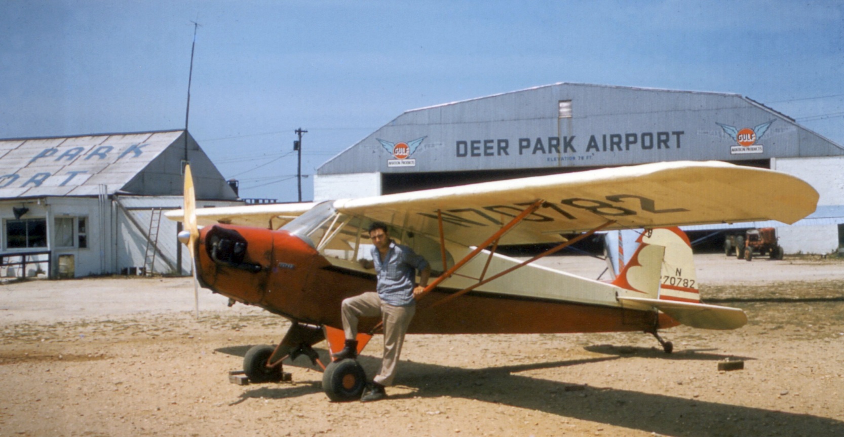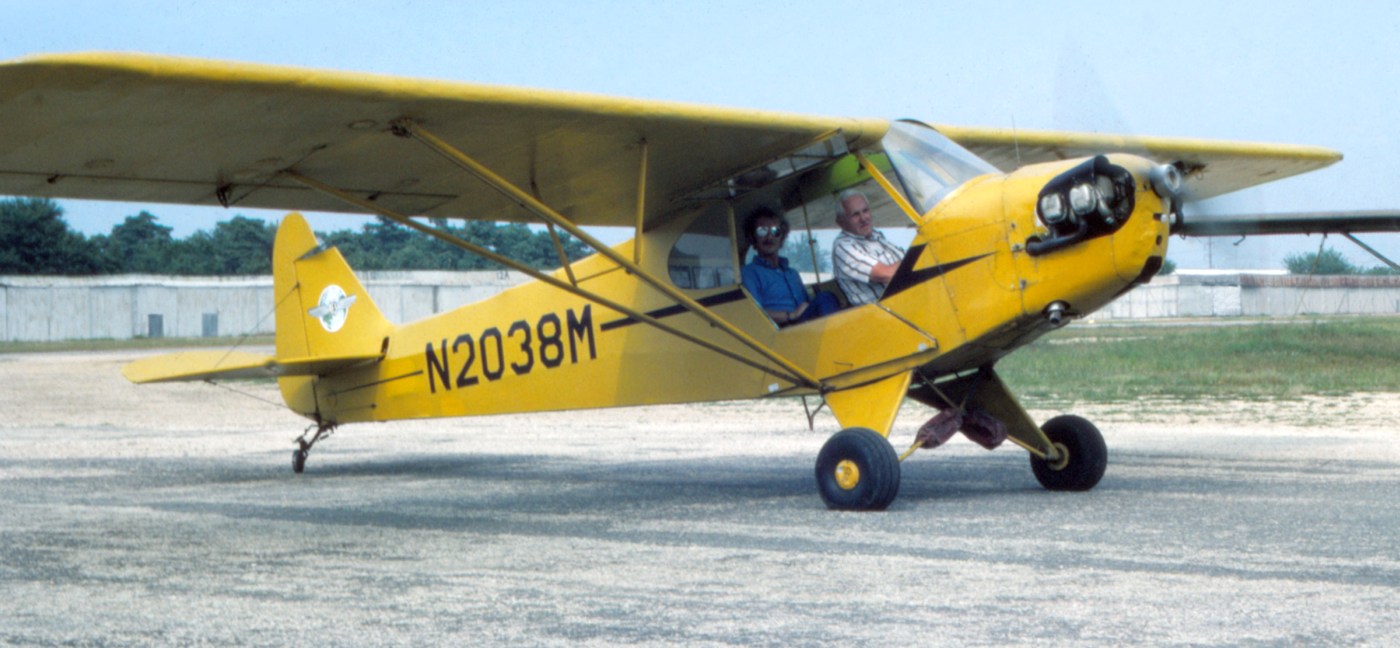 A 1954 photo (courtesy of Bob Mott) of Mario “Yogi” Barra at Deer Park Airport with the Piper Cub he bought for $750 at age 18 from Lou Mancuso who owned the field & operated Mid Island Air Service.
