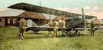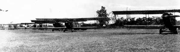 depicted 2 monoplanes & a biplane in front of a hangar.