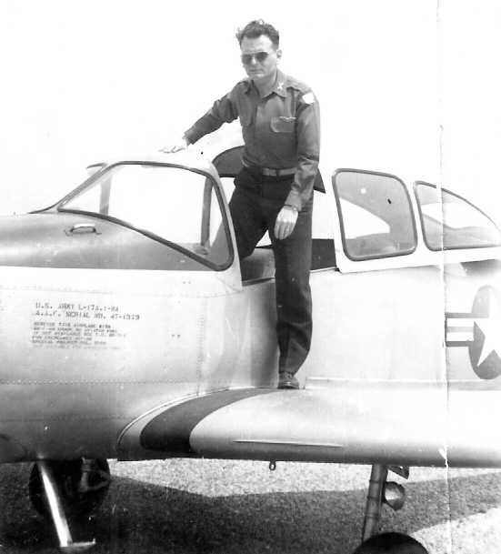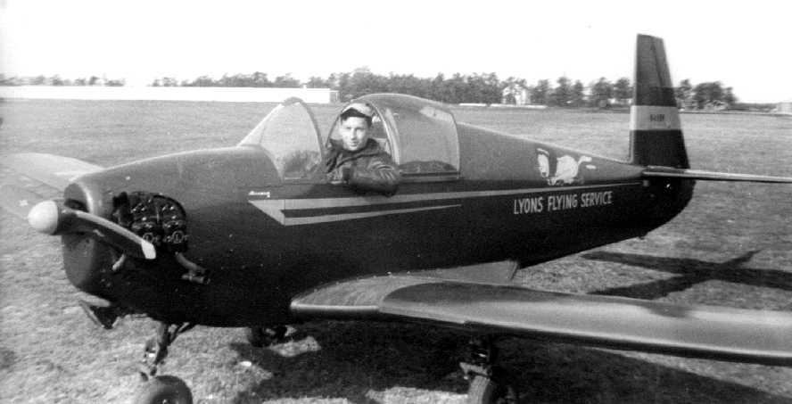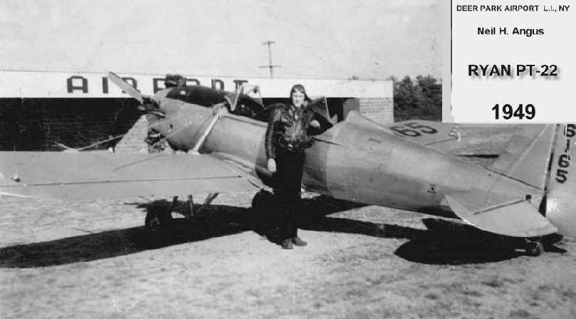 A 1949 photo of Neil Angus in front of a Ryan PT-22 & a Deer Park hangar (courtesy of Neil Angus Jr.).