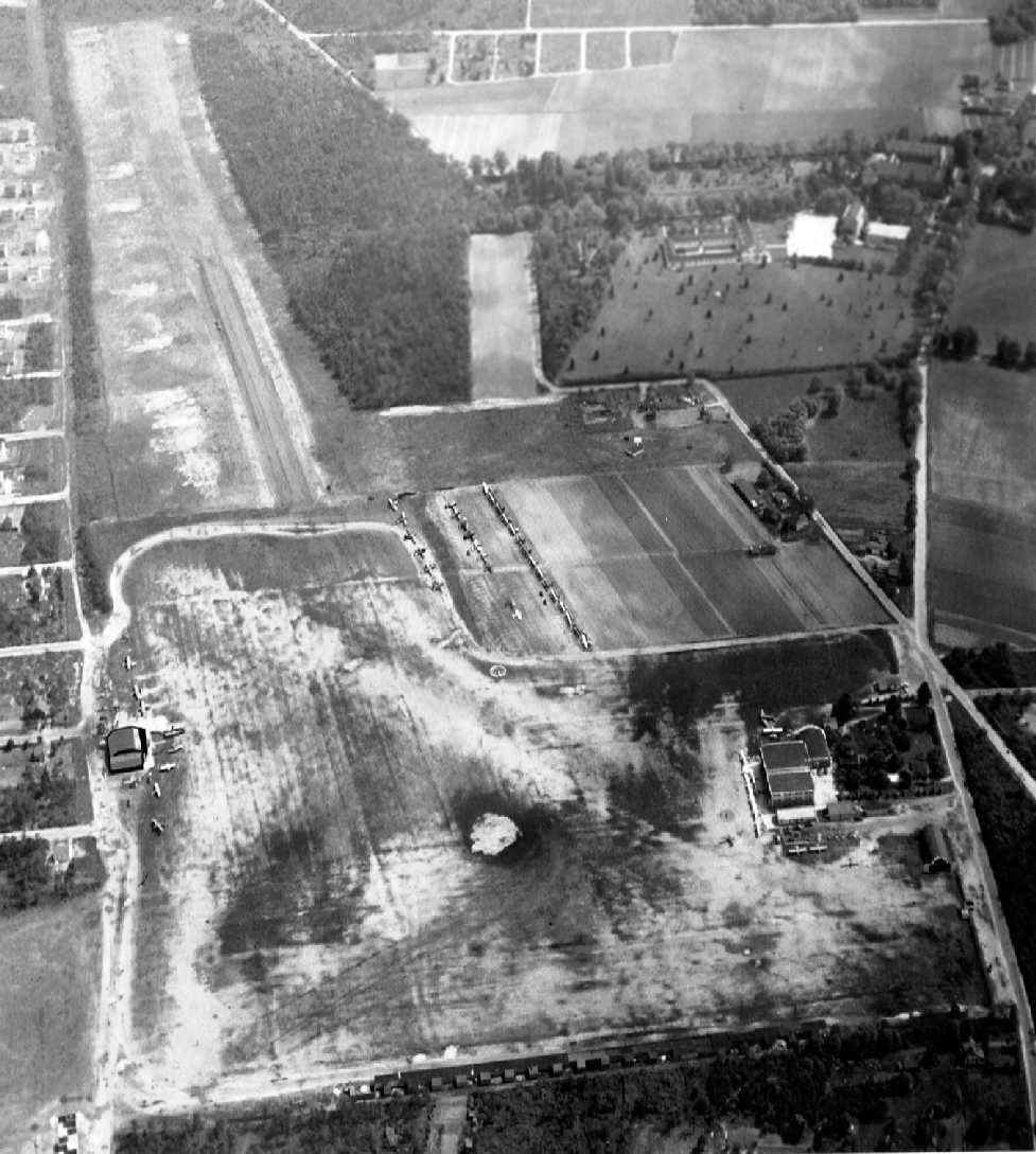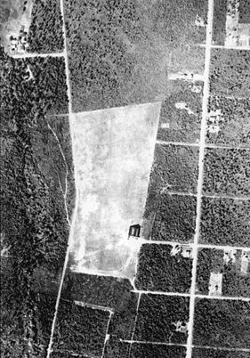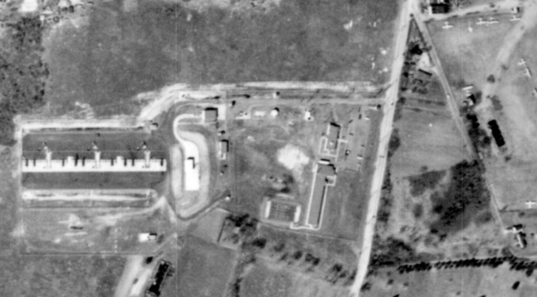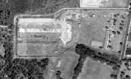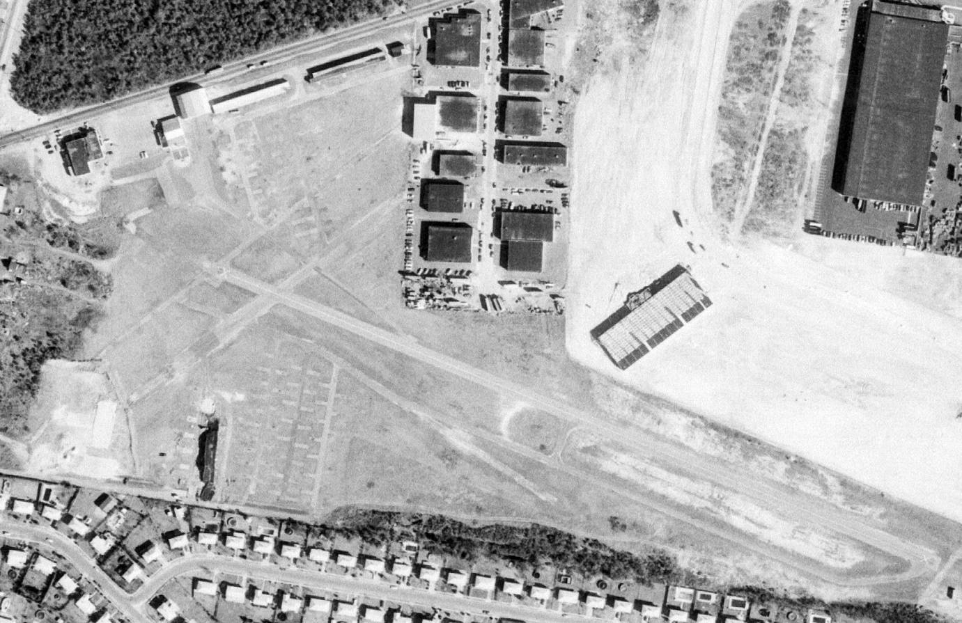 A 1980 aerial view showed that one former hangar still remained standing on the north side of the field.