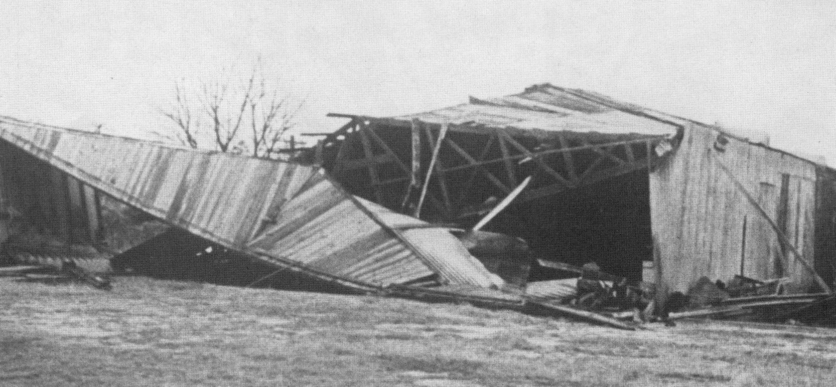 An undated photo by Danny Pflug of the Bender-Brentwood Airport hangar after its collapse on Thanksgiving weekend, 1956 (courtesy of Bob Mott).