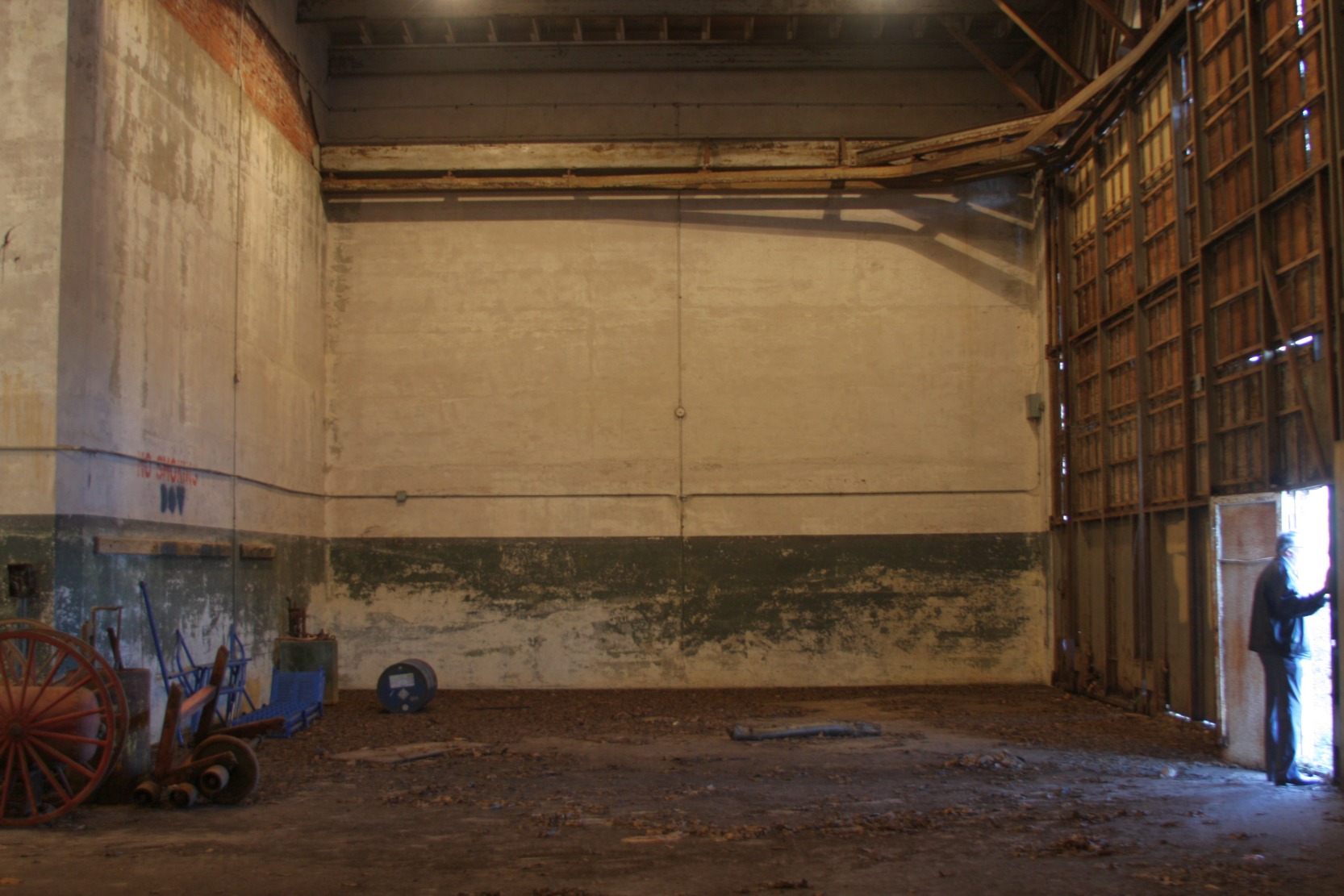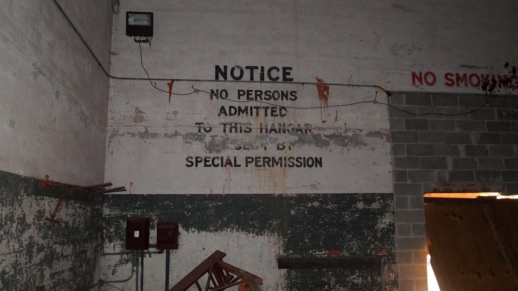 A 2011 photo of the interior of the Vanderbilt seaplane hangar, showing sign reading "Notice: No Persons Admitted To This Hangar Except By Special Permission."