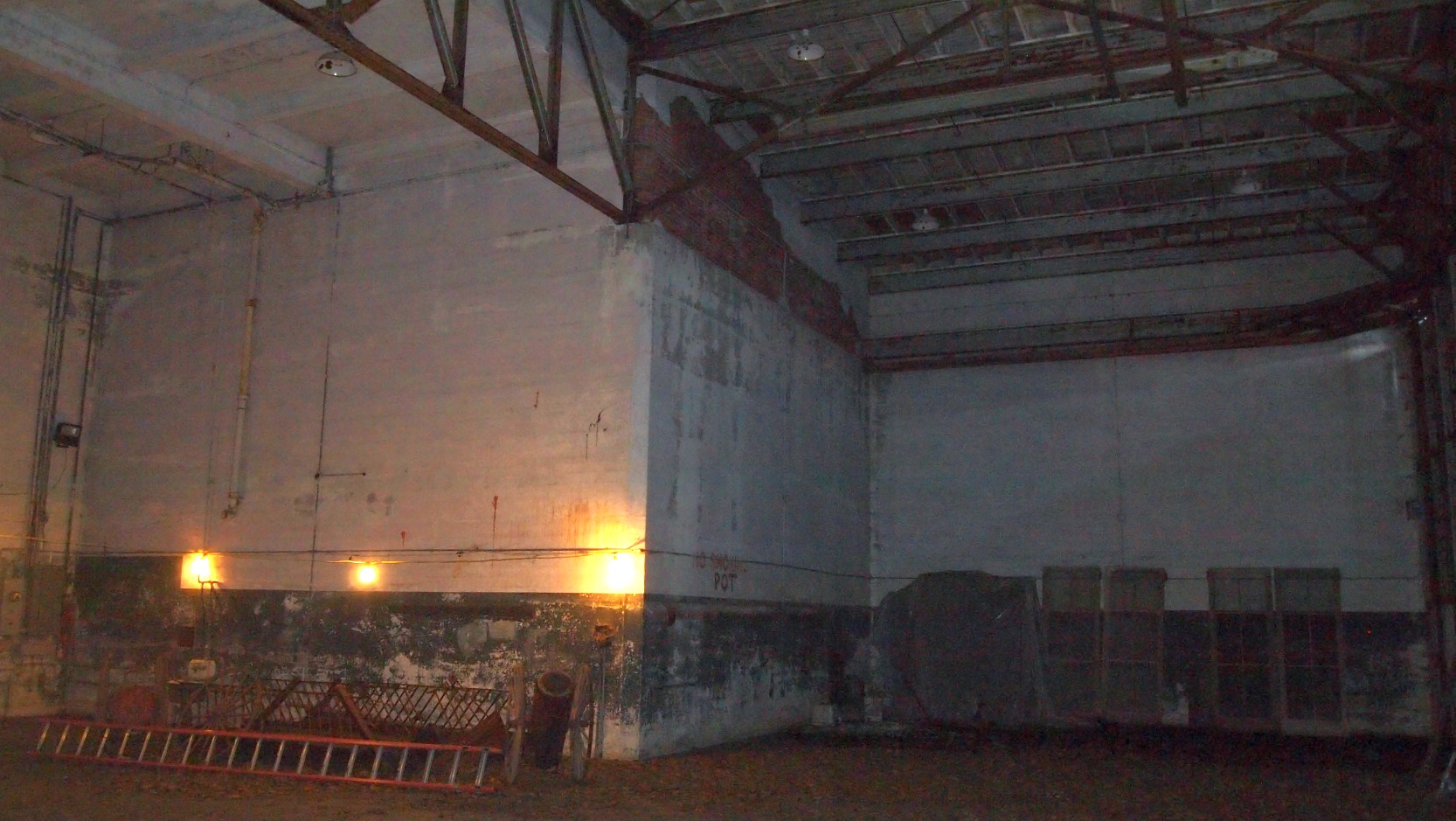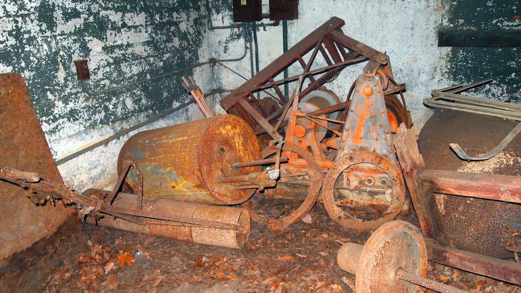 A 2011 photo of the interior of the Vanderbilt seaplane hangar, showing a rusted winch used to move Vanderbilt's seaplane from Northport Harbor.