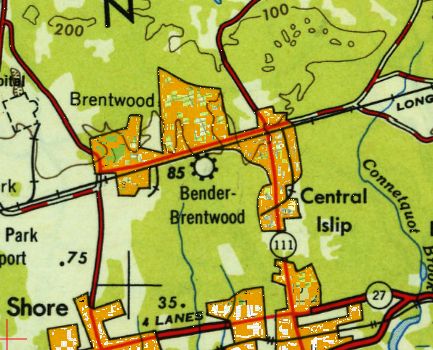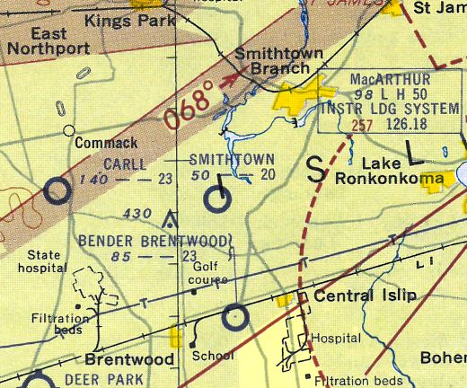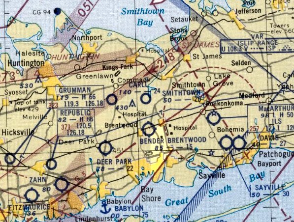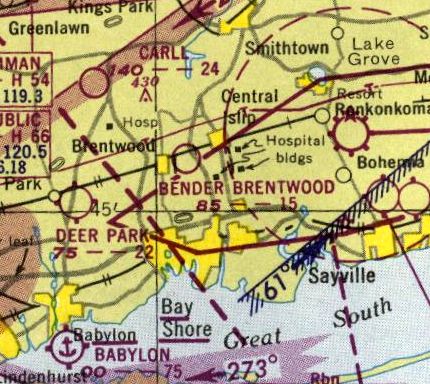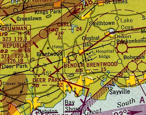 The last aeronautical chart depiction which has been located of Bender-Brentwood Airport was on the 1955 NY Sectional Chart (according to Stephen McNicoll).