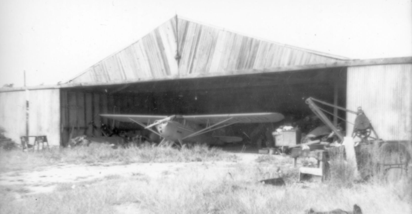 A 1948 photo by Danny Pflug of an unidentified single-engine taildragger inside the Bender-Brentwood Airport hangar (courtesy of Bob Mott).