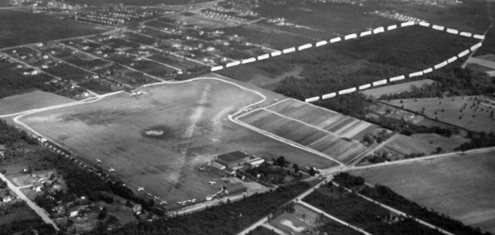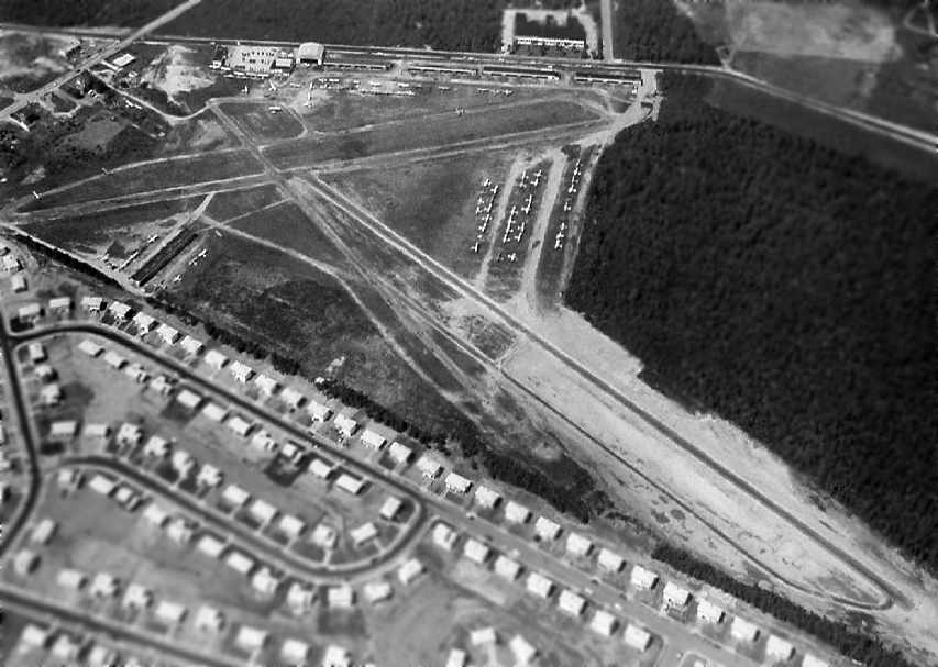devoid of aircraft, and with a row of buildings having already covered the northeastern end of the southwest/northeast runway.