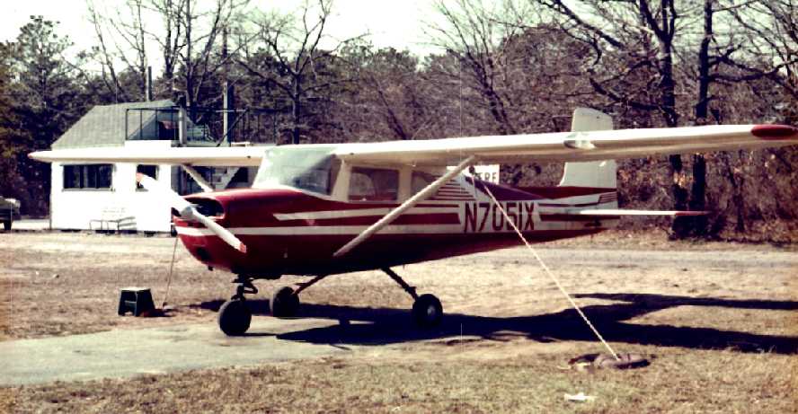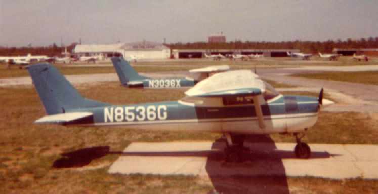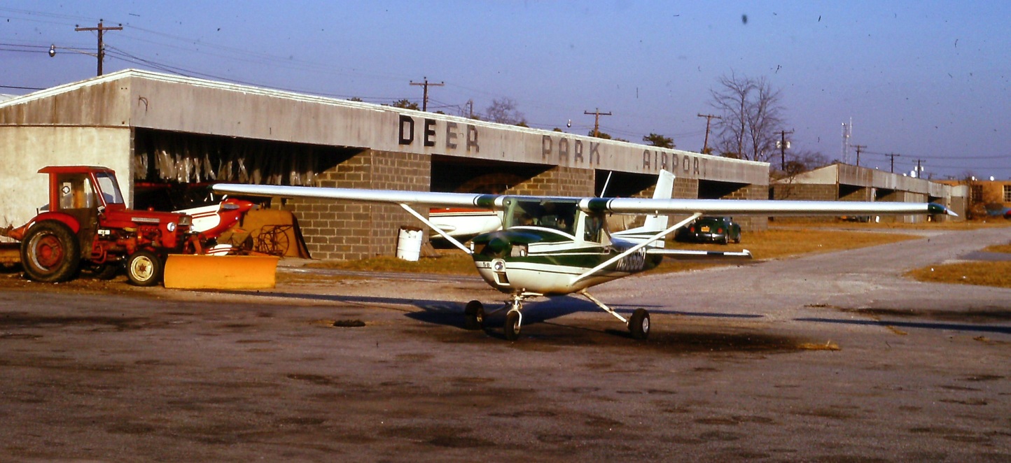 A circa 1972-74 photo by James Kovacsik (courtesy of Bob Mott) of a Cessna 150 or 152 in front of Deer Park Airport hangars.