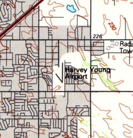 The 1990 USGS topo map depicted Harvey Young Airport as having 2 runways.