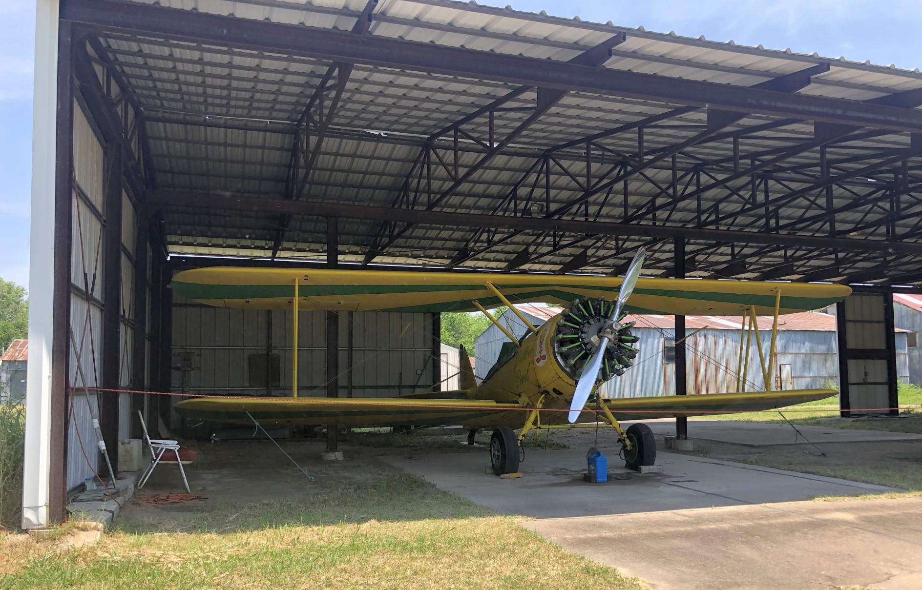 A 10/27/25 photo of what may be the last aircraft to remain at Harvey Young Airport after its closure: the pretty yellow & green Naval Aircraft Factory N3N WW2 biplane trainer inside a hangar.