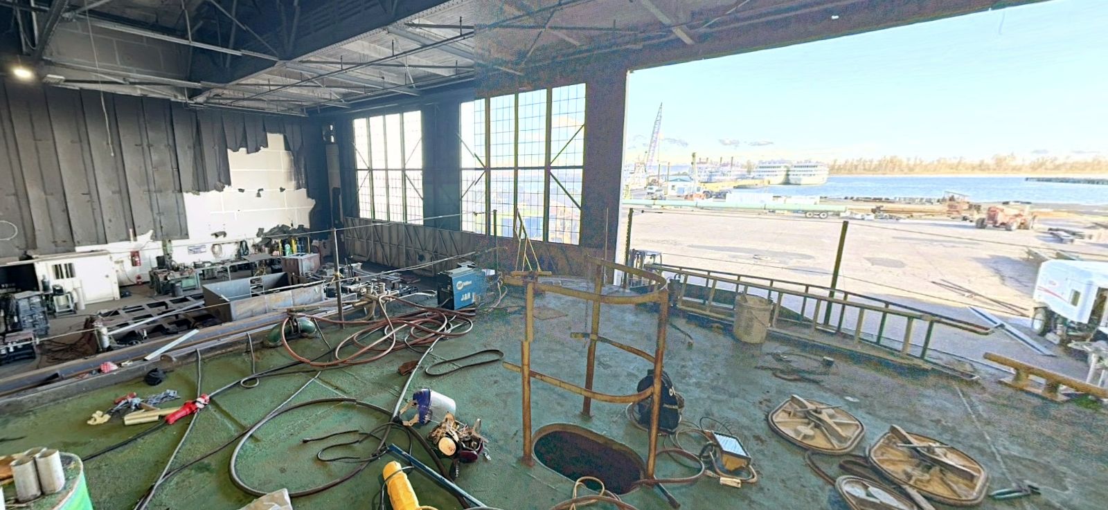 A November 2022 photo looking northeast inside the southern Tongue Point seaplane hangar.