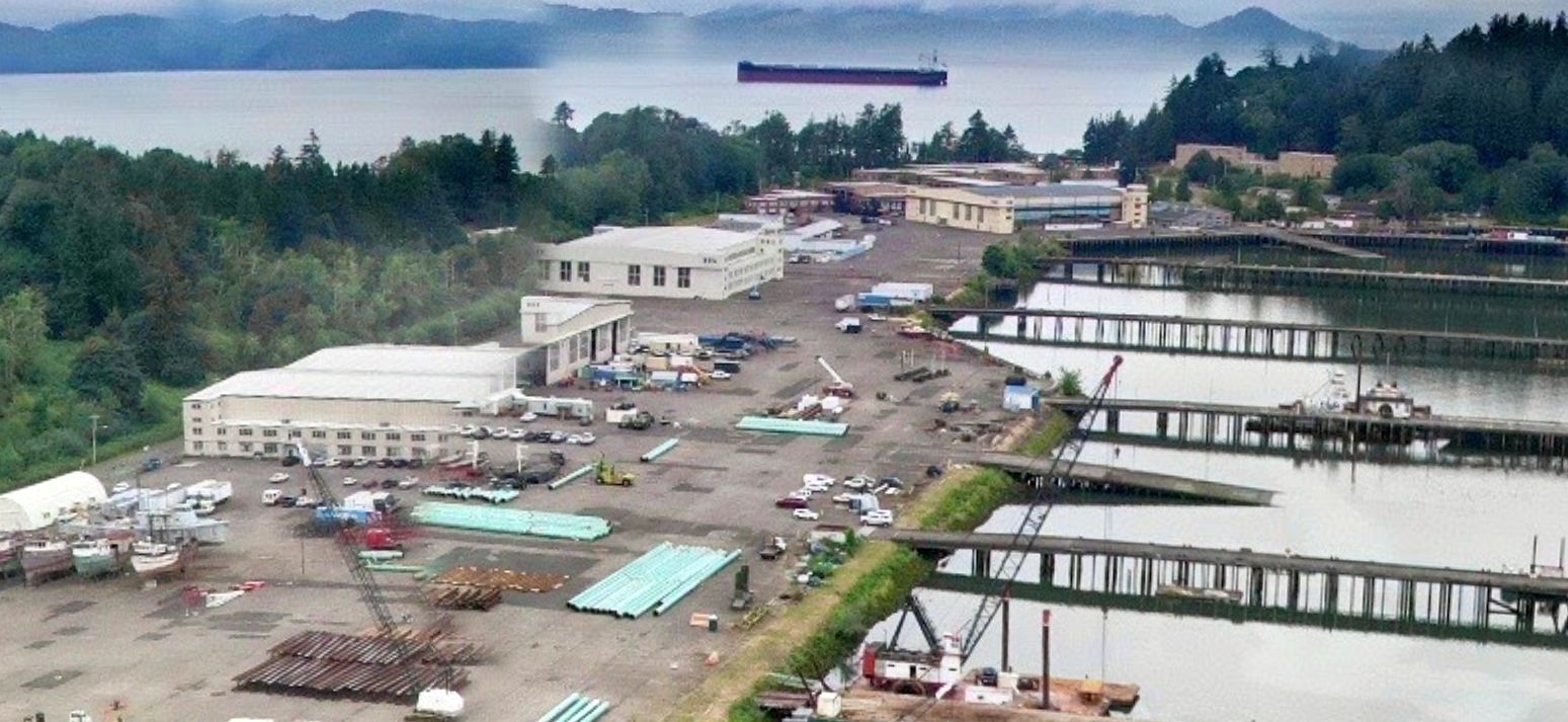 The historic USS High Point (PCH-1), the U.S. Navy's first hydrofoil, is seen at bottom-left, when it spent its last days at Tongue Point after being purchased by a private individual who intended to make her seaworthy once again.