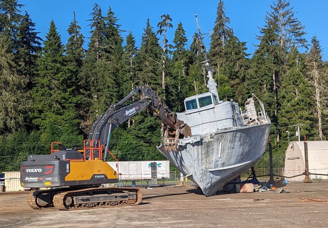 An August 2023 photo of the scrapping of the historic hydrofoil USS High Point (PCH-1) on the Tongue Point ramp, after severe corrosion was found below her waterline.