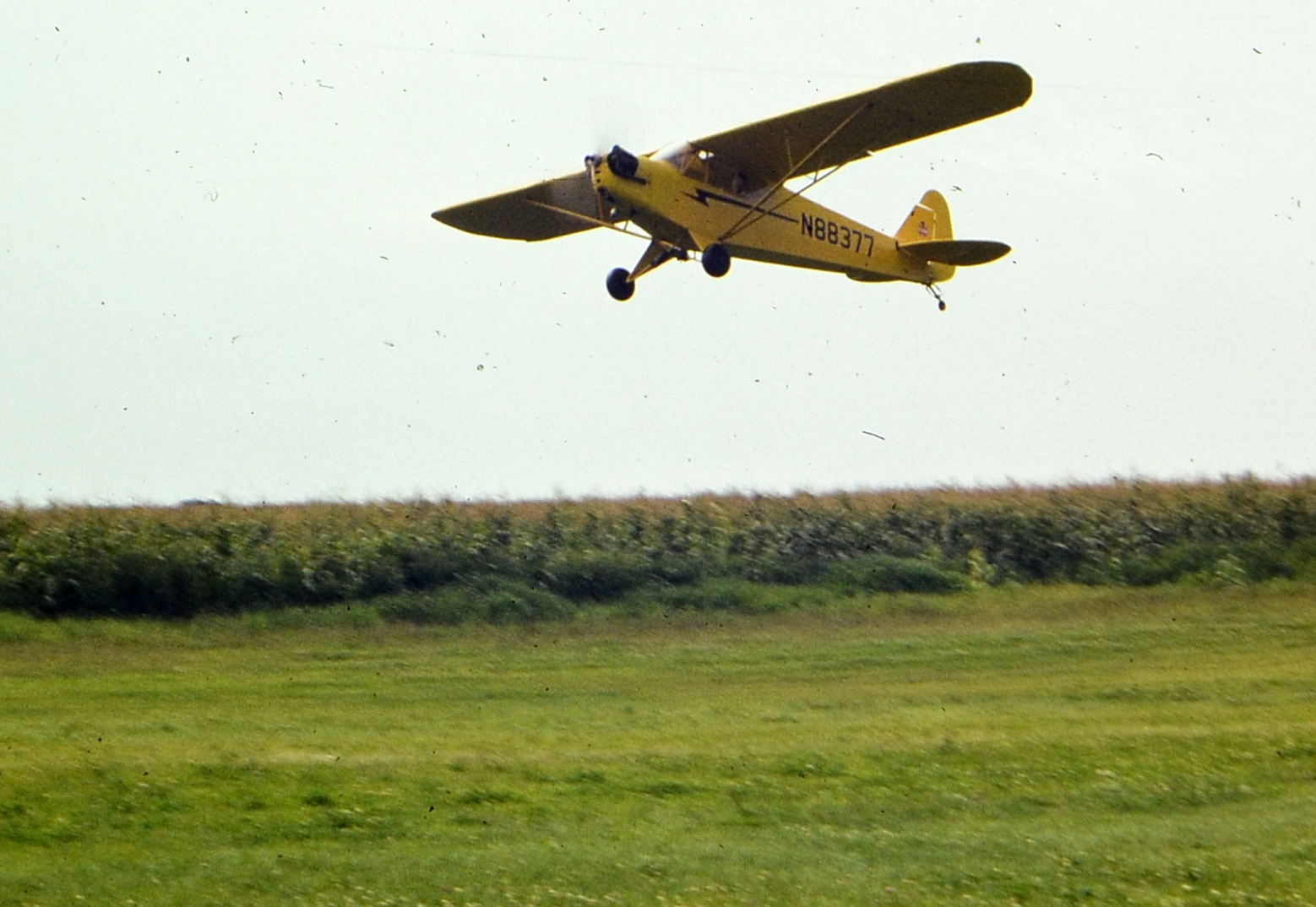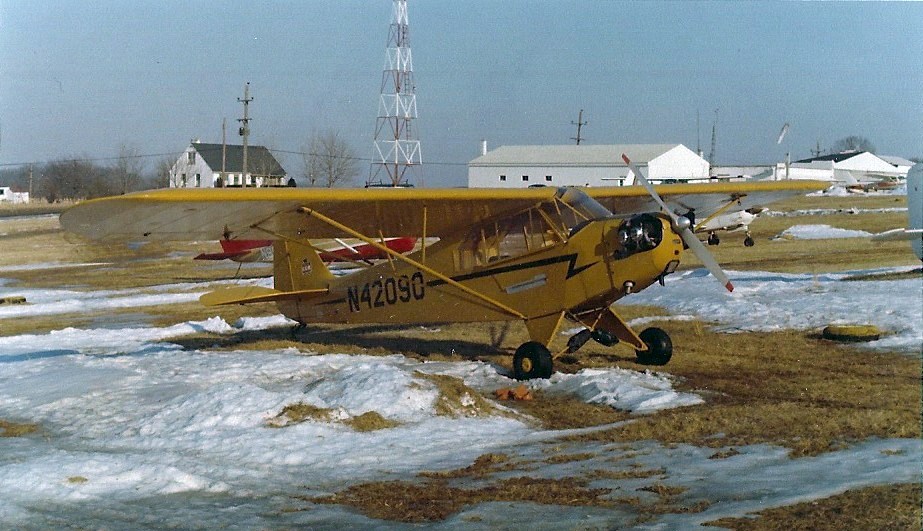 A 1975-77 photo by Ken Morrison of his Cub N42090 which he based at Shannon Airport, with the red & white beacon tower visible in the background.