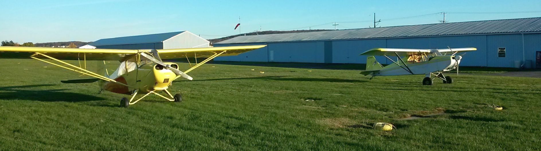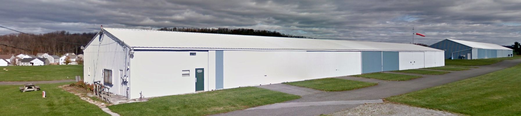 A pre-2025 photo looking southeast at 2 Aeroncas in front of the Morgantown Airport hangars.