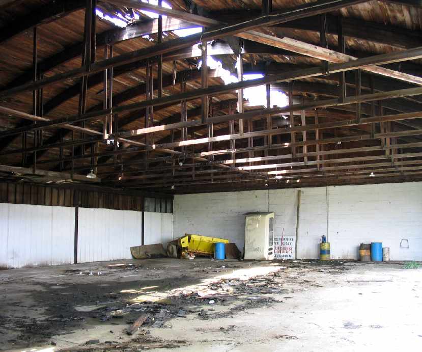 A 2007 photo by Paul Freeman of the interior of the Stoltzfus hangar, showing the hole in the roof.