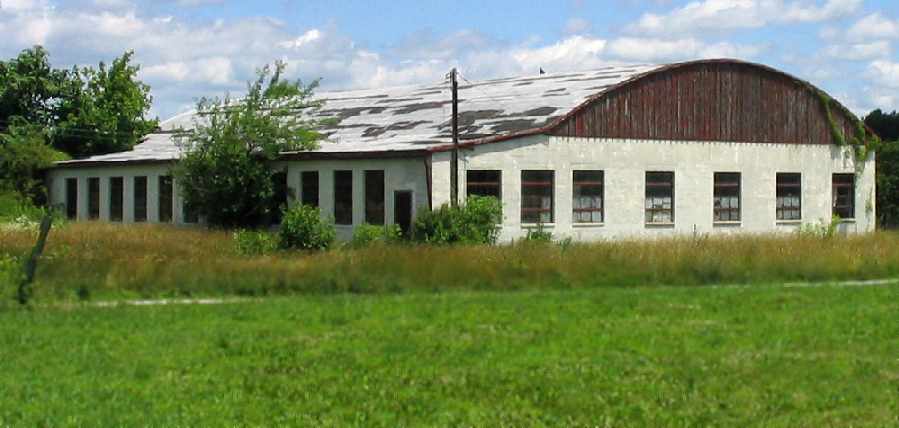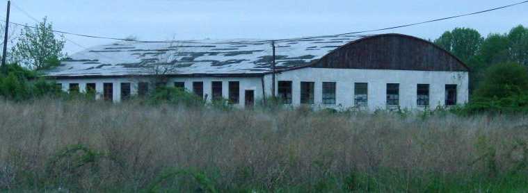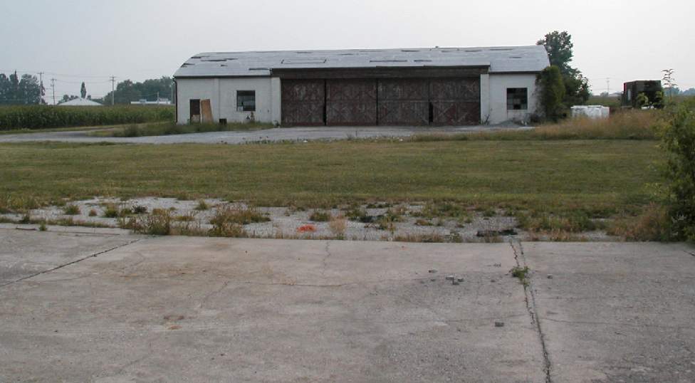 A 2008 photo by Rick Davis looking northeast at the former hangar which remains standing at the site of Stoltzfus Field.