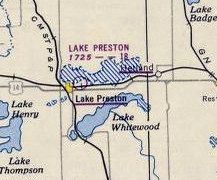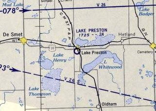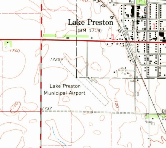 It depicted “Lake Preston Municipal Airport” as having an unpaved northwest/southeast runway, with 1 small building on the northeast side.