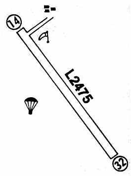 A cluster of three buildings were depicted on the north side of the airfield, and a parachute drop zone was depicted on the west side of the field.