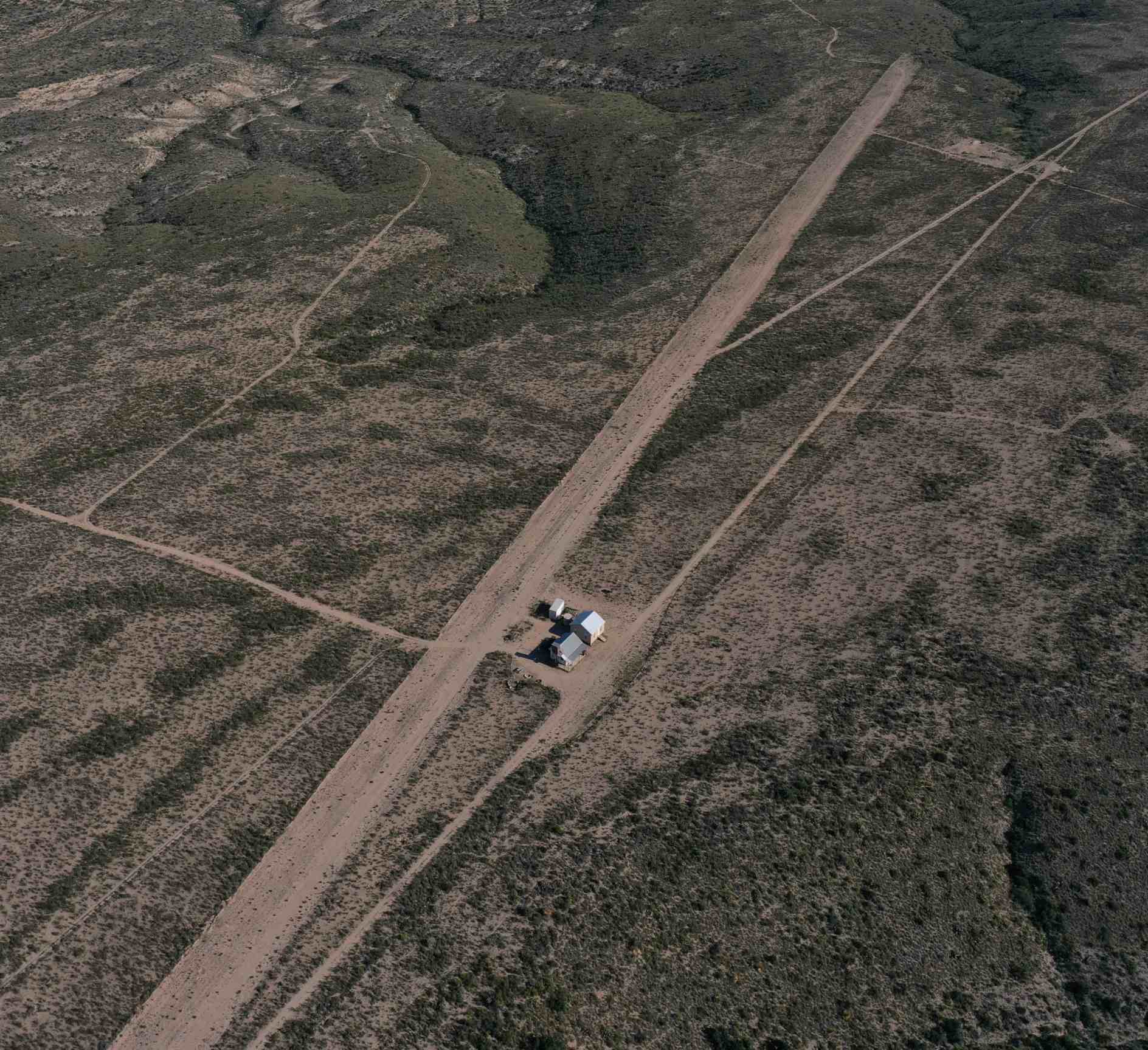 An aerial view looking east at the original Marfa Municipal Airport,