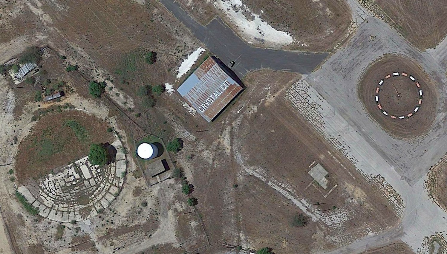 A 2014 aerial view showed the largest former hangar at the site of Crystal City Municipal Airport still had “Crystal Cit” painted on its roof, and the red & white segmented circle remained to the east.