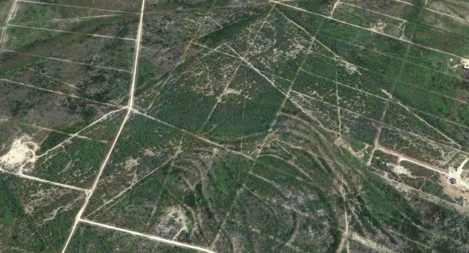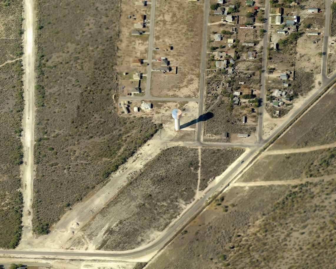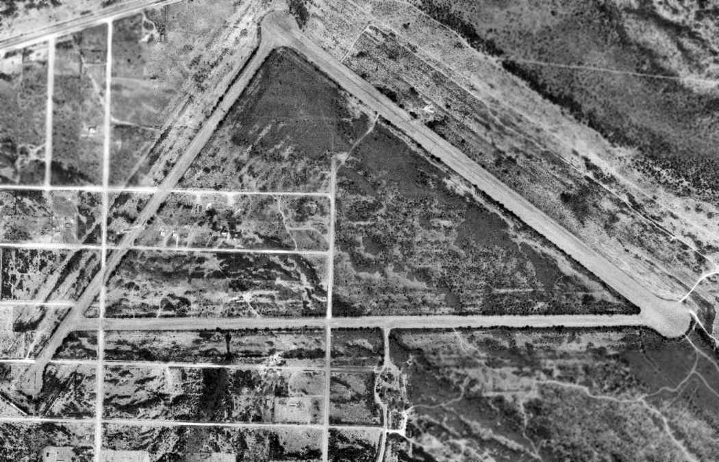 A circa 2010 aerial view looking west showed the eastern end of 2 former Val Verde County Airport runways remained recognizable.