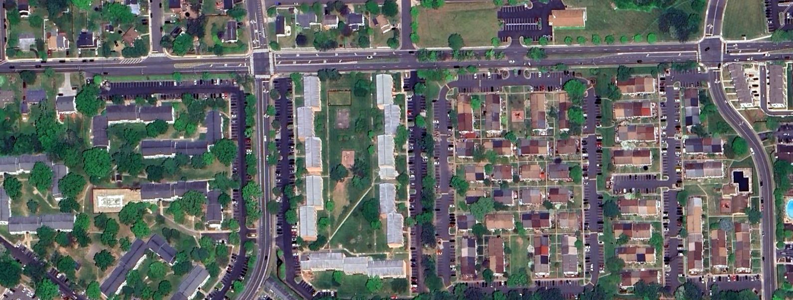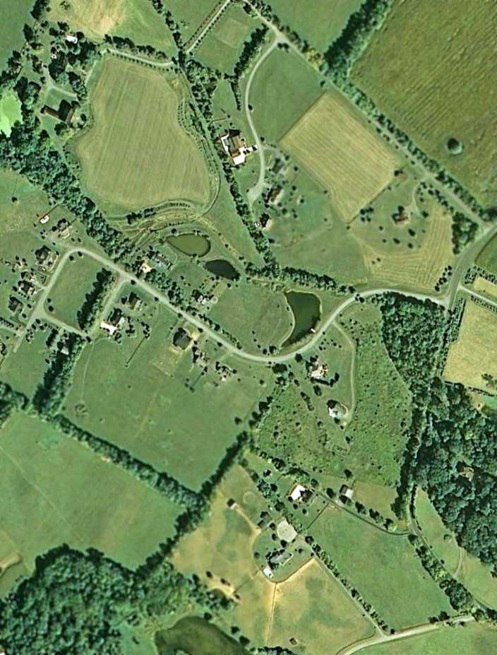 with a few small buildings along the road along the east side of the field.