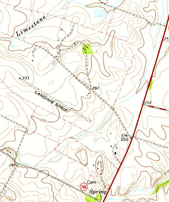 The single 3,800' northwest/southeast runway of the Lipscomb Airfield was labeled simply as “Landing Strip” on the 1984 USGS topo map.