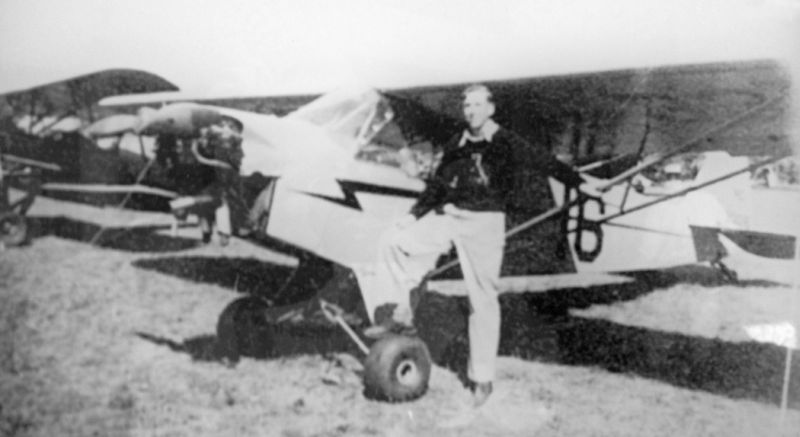 An undated photo of an unidentified pilot in front of a Piper J-3 Cub at the original Leesburg Airport.