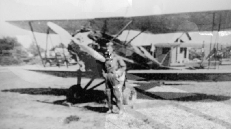 An undated photo of an unidentified pilot in front of a biplane at the original Leesburg Airport.