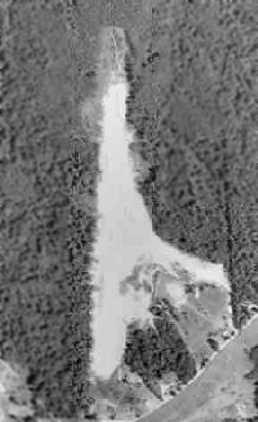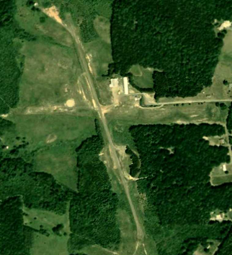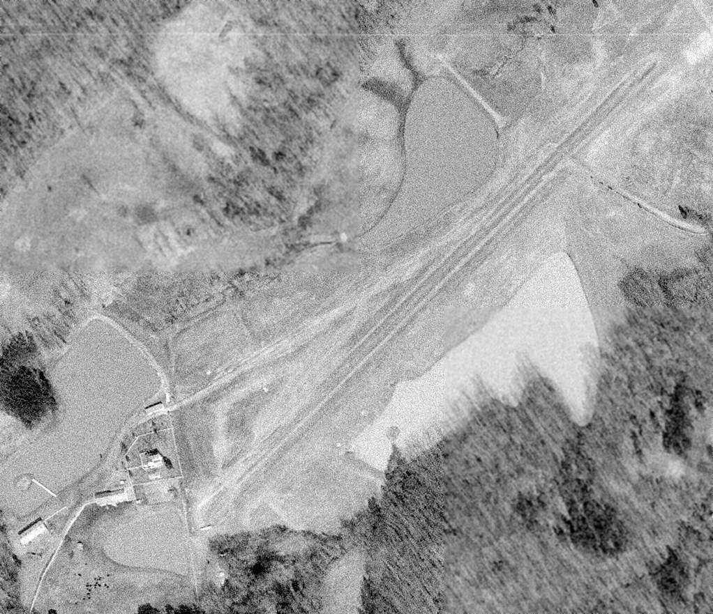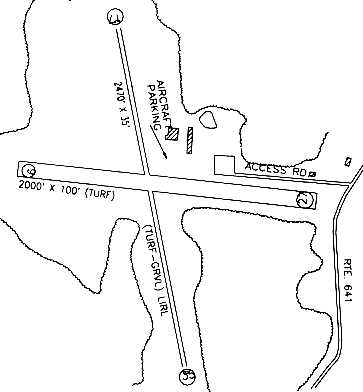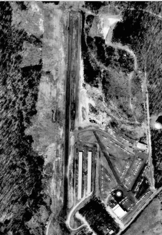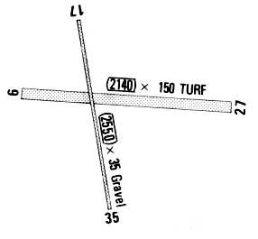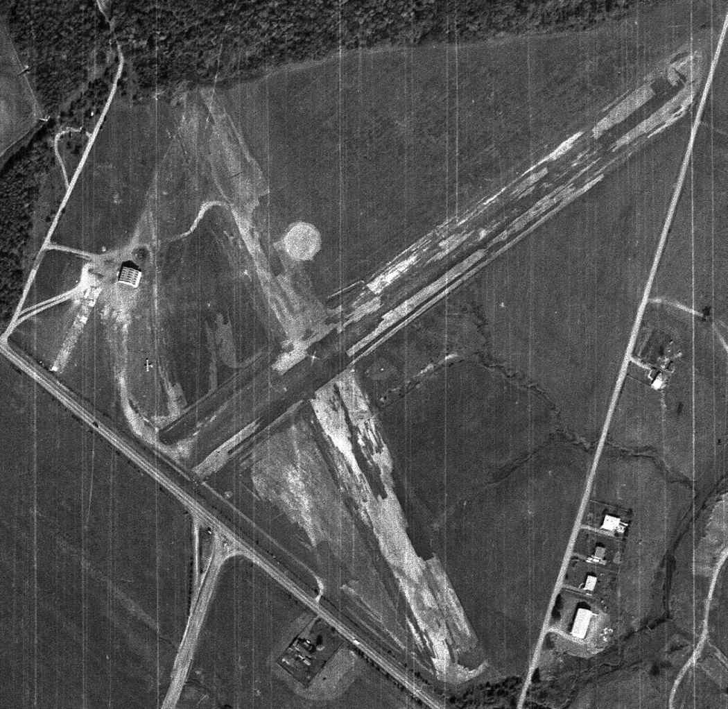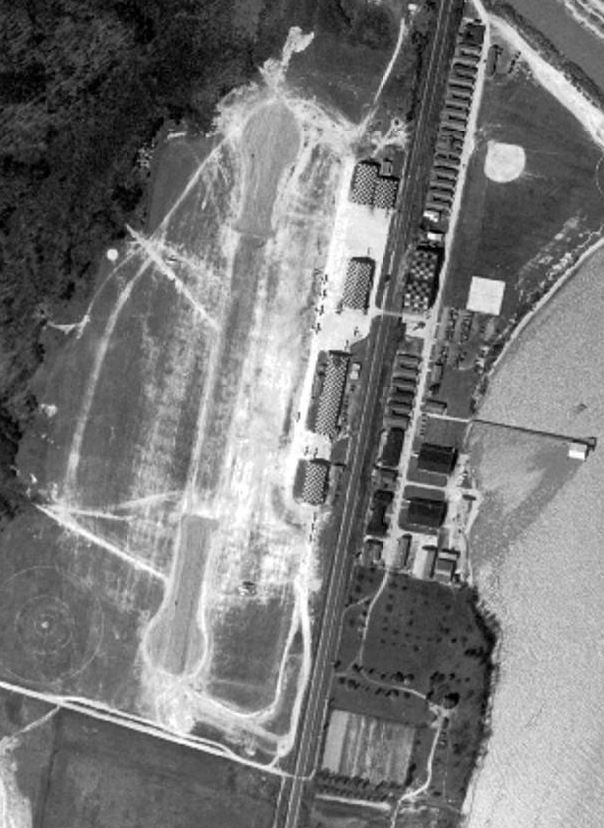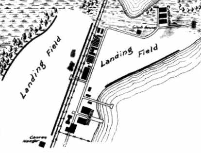 which depicted a single unpaved northeast/southwest runway, with a cluster of small buildings on the east side.