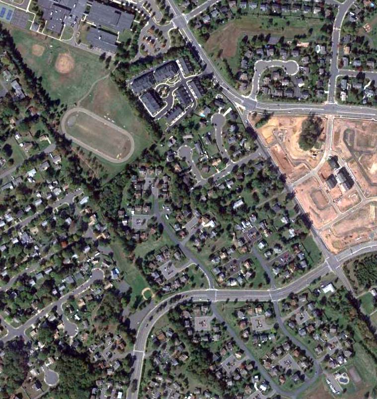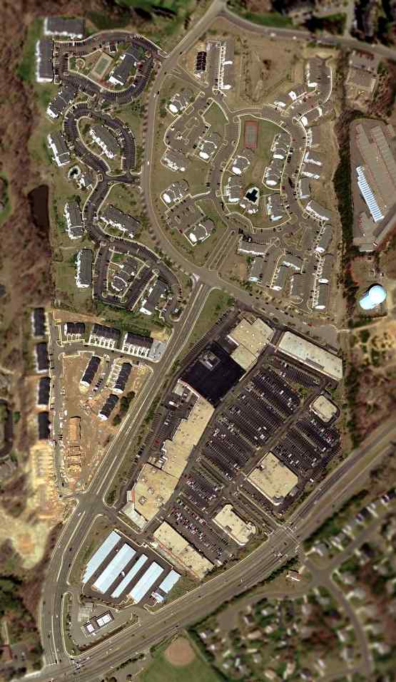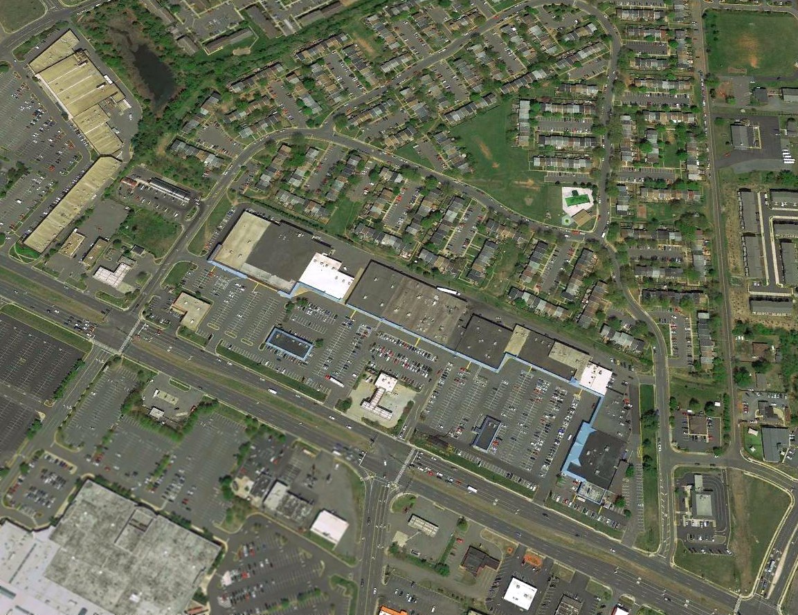 A 2018 aerial view looking northeast at the site of the former Manassas Airport, now occupied by the Manaport Shopping Center & houses.