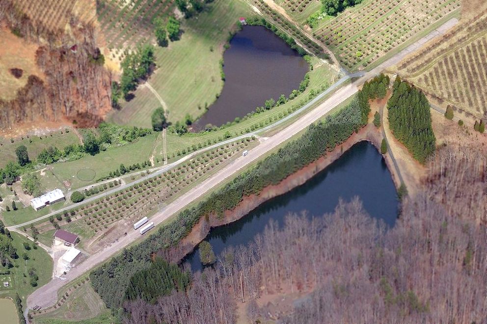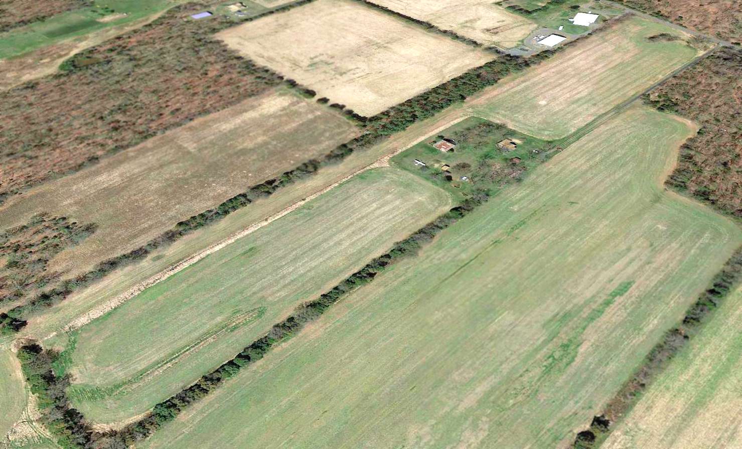 A 2015 aerial view looking north depicted Flying T Farm Airfield as having several trailers parked along its runway.